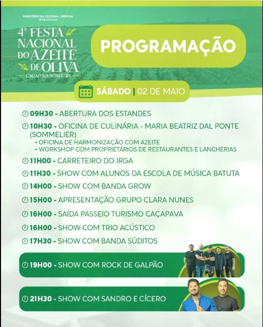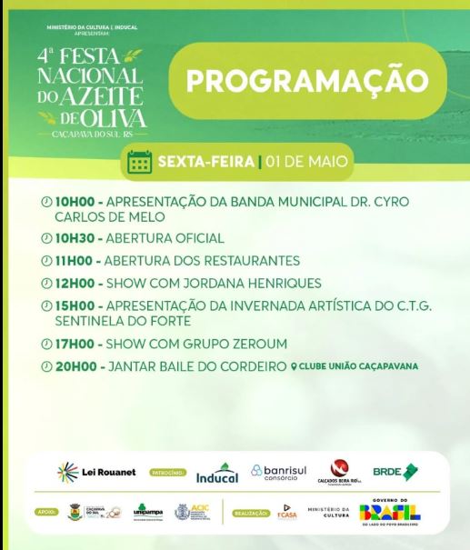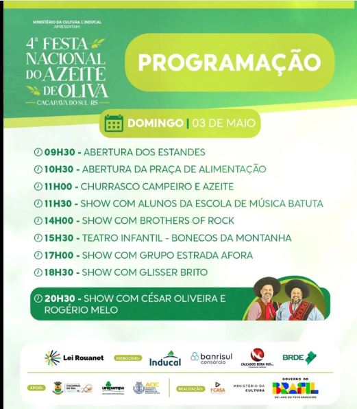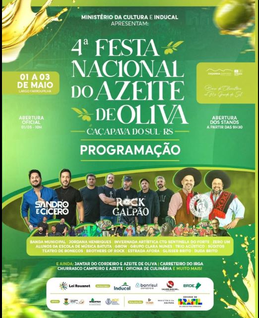 Caçapava do Sul, Eventos, Potencialidades, Turismo Regional CAÇAPAVA DO SUL: Vem aí a 4ª Festa Nacional do Azeite de Oliva abril 27, 2026 admin Deixe um comentário FONTE: Divulgação.