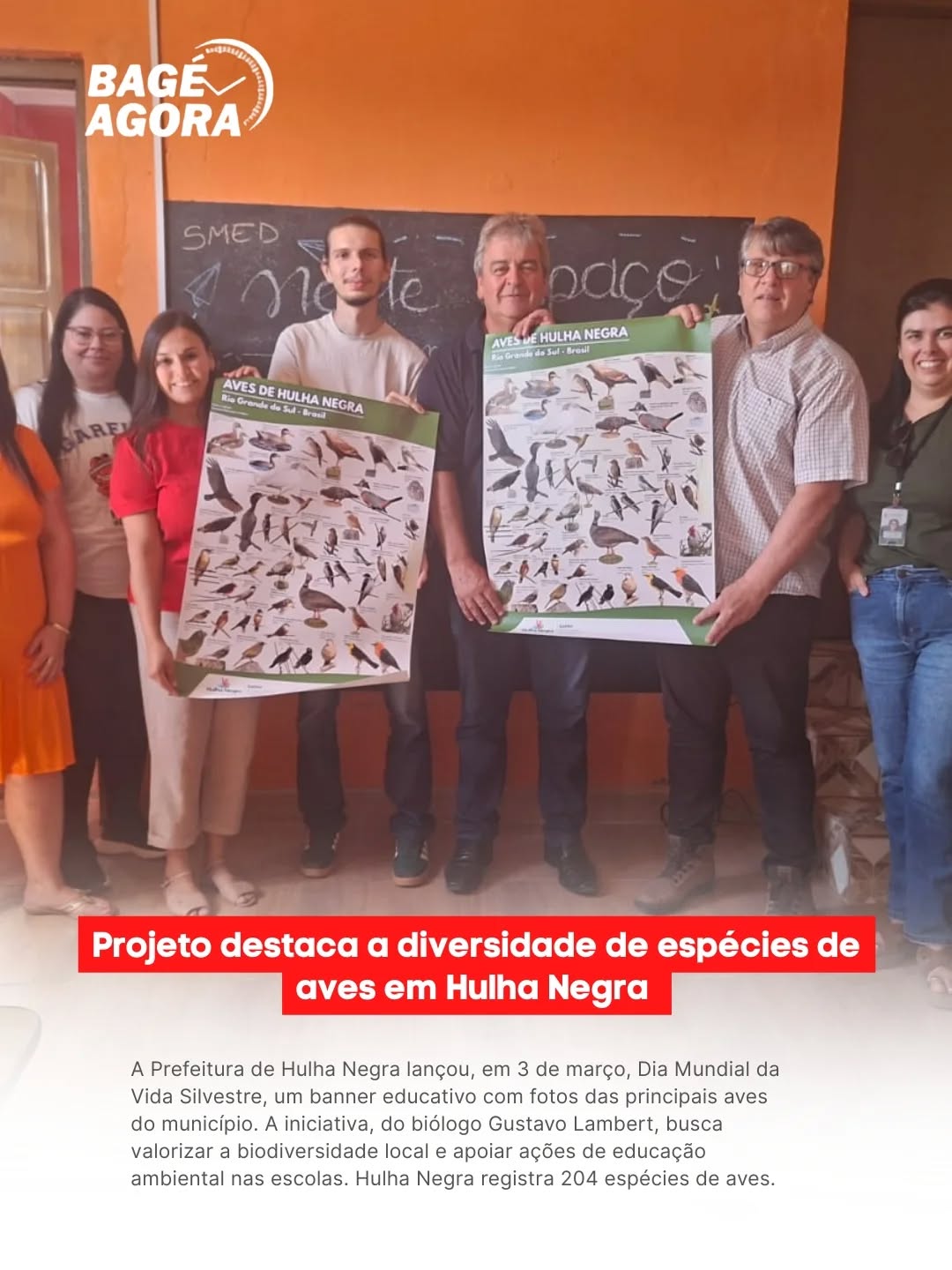 O Departamento de Meio Ambiente da Prefeitura de Hulha Negra lançou no dia 3 de março, data que marca o dia mundial da vida silvestre, um banner educativo com fotos das principais aves identificadas no município. O projeto foi uma iniciativa a partir do trabalho de pesquisa do biólogo e licenciador ambiental da Secretaria de Administração, Planejamento e Meio Ambiente, Gustavo Lambert.