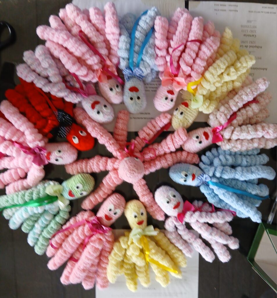 Anualmente, as Voluntárias da Olaria organizam a arrecadação de materiais para os kits “Cegonha com Amor”, destinados às gestantes das comunidades de Lavras do Sul, com trabalhos manuais feito com amor e carinhos pelas artesãs locais, como os polvinhos. Prestigiem e valorizem este projeto!