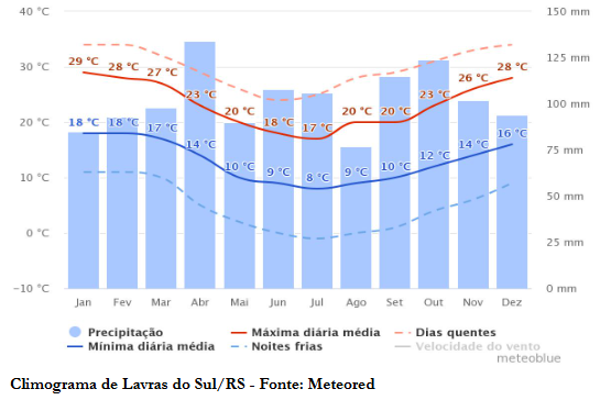 No Município existe uma pluviosidade significativa ao longo do ano. Mesmo o mês mais seco ainda assim tem muita pluviosidade. Sobre as temperaturas, a média anual é de 18°C, e a pluviosidade média anual é de 1408 mm. Dezembro é o mês mais seco, com 96 mm. Em setembro cai a maioria da precipitação, com uma média de 135 mm. Janeiro é o mês mais quente do ano com uma temperatura média de 23°C. Ao longo do ano, junho tem uma temperatura média de 13,3°C, sendo a média mais baixa do ano. O engenheiro agrônomo Luiz Fernando Saraiva de Souza (Nanana) mantém, na propriedade da Chácara do Laranjal, próxima à Sede Municipal, um espaço para a medição da pluviosidade (volume de chuvas), cujos resultados são bastante divulgados pelos órgãos locais de mídia. A Rádio Pepita FM também contribui com o fornecimento de informações meteorológicas, transmitindo a cada meia hora, nos intervalos comerciais de sua programação, dados sobre a temperatura no momento na cidade. Extremos na pluviosidade nos últimos anos em Lavras do Sul Nos últimos anos, estão mais comuns em Lavras do Sul os extremos de chuva, com irregularidades nos volumes e períodos alternados de muita chuva ou de uma grande falta de chuvas. No século XXI, pelo menos dois períodos de estiagem afetaram Lavras do Sul, com consequências na agropecuária e na vida da população: entre 2010 e 2013 e entre 2021 e 2023. Após cerca de dois anos de estiagem (2021 e 2022), por influência da fenômeno “La Niña” (esfriamento das águas do Oceano Pacífico, no litoral do Peru, que provoca seca no sul do Brasil e chuvas excessivas em outras regiões do país), o Rio Grande do Sul e também Lavras do Sul agora (2023) tem a influência climatológica do “El Niño” (o oposto do “La Niña”, formando um grande volume de chuvas no sul e seca na Amazônia e Nordeste). Com isso, em setembro de 2023, até o dia 27/09/2023, foram registrados 606 mm no município, de acordo com a coleta na Chácara do Laranjal, de propriedade do sr. Luiz Fernando Saraiva Souza (Nanana), superam o mesmo mês em 2001 (441 mm, antigo recorde em 41 anos).