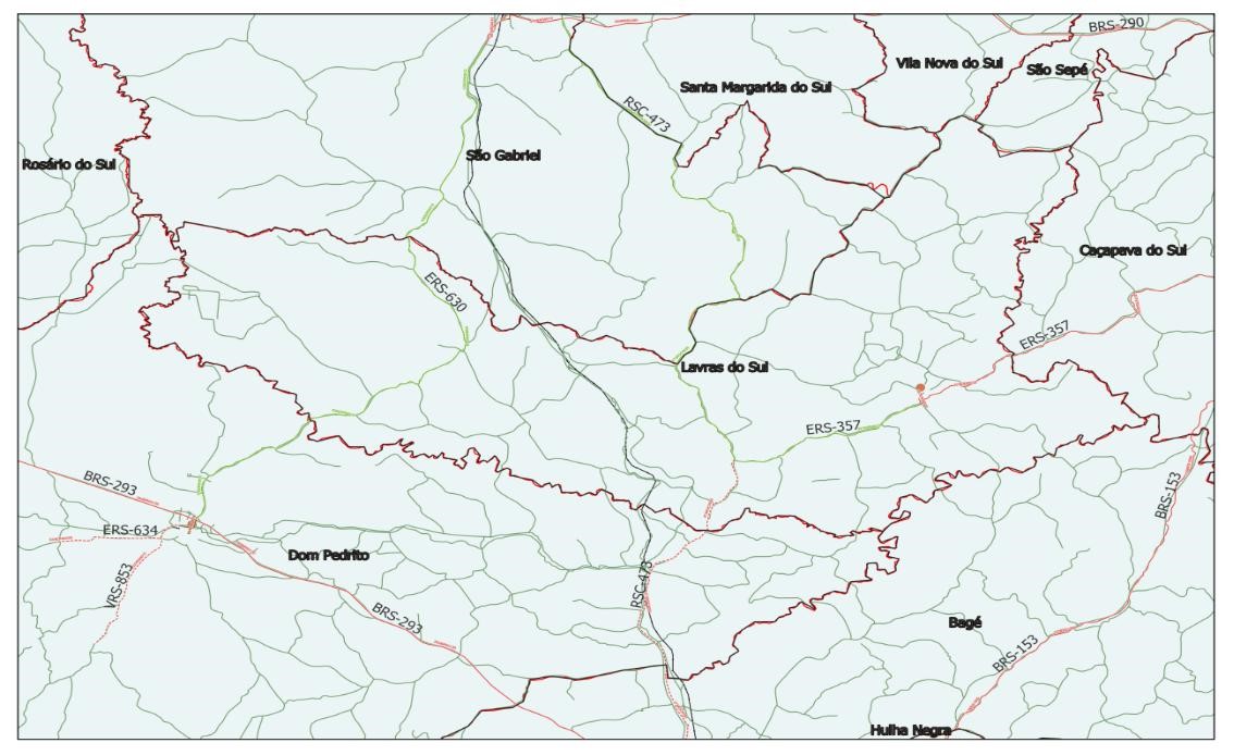 Mapa básico de vias de acesso de Lavras do Sul/RS (2023) - elaborado pelo autor